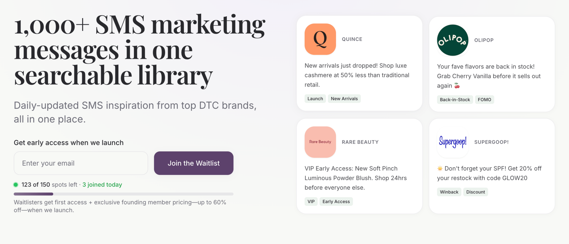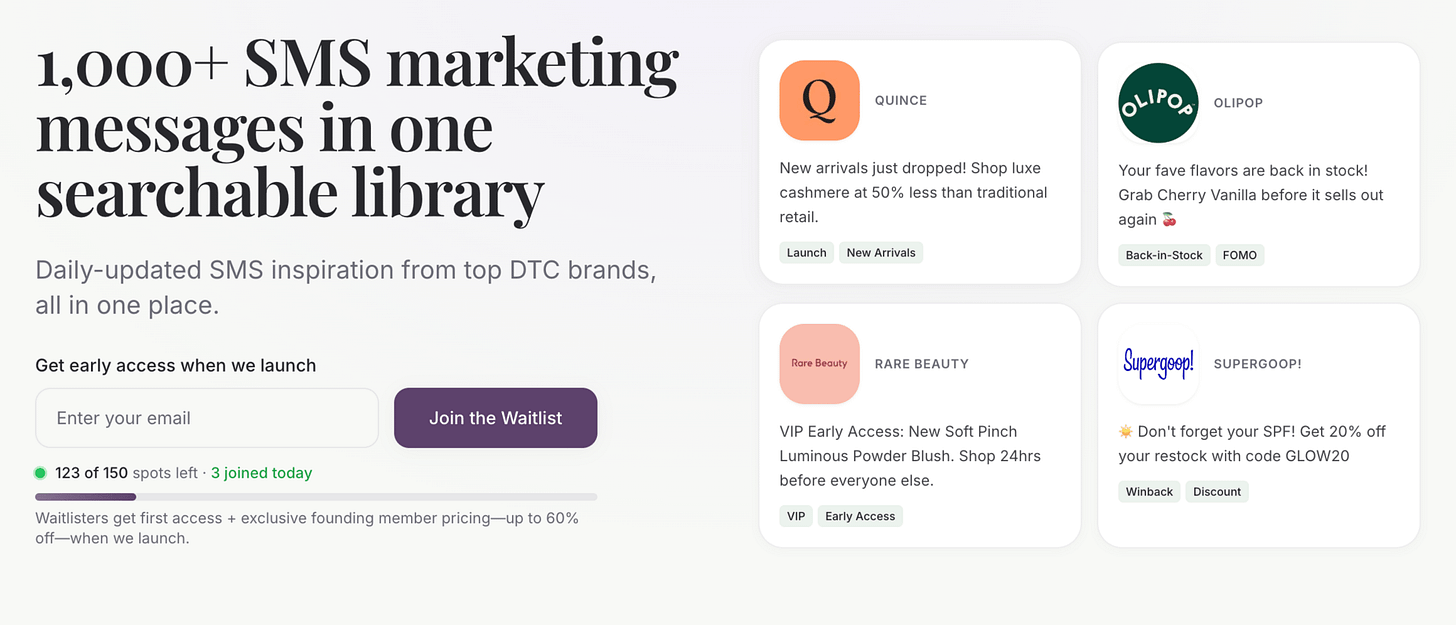 So I built what I kept wishing existed: a searchable library where you can actually find that perfect launch text or back-in-stock example when you need it. 1,000+ campaigns from brands like Olipop, Quince, and Rare Beauty, with new ones added every day.